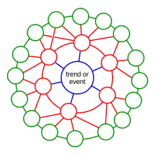 To start a futures wheel the central term describing the change to evaluate is positioned in the center of the page (or drawing area). Then, events or consequences following directly from that development are positioned around it. Next, the (indirect) consequences of the direct consequences are positioned around the first level consequences. The terms may be connected as nodes in a tree (or even a web). The levels will often be marked by concentric circles.