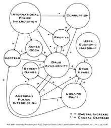 Fuzzy cognitive maps (FCMs) have gained considerable research interest due to their ability in representing structured knowledge and model complex systems in various fields. This growing interest led to the need for enhancement and making more reliable models that can better represent real situations. A first simple application of FCMs is described in a book[11] of William R. Taylor, where the war in Afghanistan and Iraq is analyzed. In Bart Kosko's book Fuzzy Thinking,[12] several Hasse diagrams illustrate the use of FCMs. As an example, one FCM quoted from Rod Taber[13] describes 11 factors of the American cocaine market and the relations between these factors. For computations, Taylor uses pentavalent logic (scalar values out of {-1,-0.5,0,+0.5,+1}). That particular map of Taber uses trivalent logic (scalar values out of {-1,0,+1}). Taber et al. also illustrate the dynamics of map fusion and give a theorem on the convergence of combination in a related article.[14]