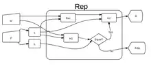 The reproduce function also makes use of the hash functions and . In addition to verifying that the biometric input is similar enough to the one recovered using the function, it also verifies that the hash in the second part of was actually derived from and . If both of those conditions are met, it returns , which is itself the second hash function applied to and . Formally: