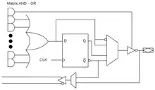 The GAL22V10 has 12 input pins, and 10 pins that can be configured as either inputs or outputs, and exists in various switching speeds, from 25 to 4 ns.[1][2][4] Each output is driven by an output-logic macrocell (OLMC), with an output-enable product term, and a variable number of product terms, ranging from eight to sixteen. Each OLMC may be set to output as inverting or non-inverting, and be placed into either registered or combinatorial mode. In registered mode, each macrocell actively uses a D-flip-flop to hold a state under control of the data input from the logic portion of the macrocell and the rising edge of the clock signal, while in combinatorial mode the flip-flop is removed from the macrocell and the outputs are driven directly by the logic. In the latter mode, the pin may also dynamically switch between input and output based on the product term. In either mode the pin value is fed back into the array as a product term. Combinations are set using an E2PROM.[3] The output registers can be preloaded into a potentially invalid state for testing by a GAL22V10 programmer. Inputs and outputs include active pull-ups and are transistor-transistor logic compatible due to high-impedance buffers.[5]