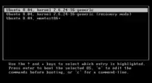 nvidia-current, one could appendmodprobe.blacklist=nvidia-currentat the end of the kernel parameters. - By pressing c, the user enters the GRUB command line. The GRUB command line is not a regular Linux shell, like e.g. bash, and accepts only certain GRUB-specific commands, documented by various Linux distributions.[12]