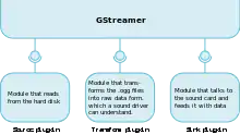 The diagram to the right could exemplify playing an MP3 file using GStreamer. The file source reads an MP3 file from a computer's hard-drive and sends it to the MP3 decoder. The decoder decodes the file data and converts it into PCM samples which then pass to the sound-driver. The sound-driver sends the PCM sound samples to the computer's speakers.
