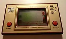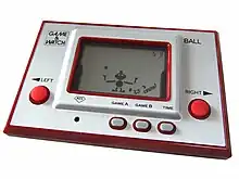 The device would be called the Game & Watch, reflecting the dual functionality of the device: a single game paired with a digital clock (like a watch) on an LCD screen.[8][9] The first game was called Ball, and would become one of Nintendo's first major video game hits. After the success of Ball, multiple variations of the Game & Play device were developed and released between 1980 and 1991.[10] Starting in 1981, models also included an alarm, making the device more useful as a watch.[11]