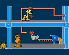 To find the chocolate-egg-laying chicken, Garfield has to manipulate the indicators on the feeding pipes in the factory. Garfield is losing energy, therefore he has to eat all kinds of food lying on the floor. He is once again joined by Odie who tries to steal the food.