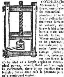 - 18th-century dictionaries and encyclopedias mention male and female screws or cochleae.[4] A 1736 builder's manual mentions screw genders as metaphors for convex and concave shapes: