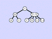 In Genetic Programming two fit individuals are chosen from the population to be parents for one or two children. In tree genetic programming, these parents are represented as inverted lisp like trees, with their root nodes at the top. In subtree crossover in each parent a subtree is randomly chosen. (Highlighted with yellow in the animation.) In the root donating parent (in the animation on the left) the chosen subtree is removed and replaced with a copy of the randomly chosen subtree from the other parent, to give a new child tree.