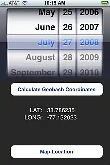 ![]() A geohashing app, converting the day's date and the Dow Jones Industrial Average into a set of coordinates | |