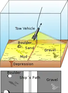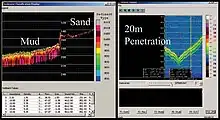 Another approach comes from greater signal processing of existing military sensors.[12] The US Naval Research Laboratory demonstrated both seafloor characterization, as well as subsurface characteristics of the seafloor. Sensors used, in different demonstrations, included normal incidence beams from the AM/UQN-4 surface ship depth finder, and AN/BQN-17 submarine fathometer; backscatter from the Kongsberg EM-121 commercial multibeam sonar; AN/UQN-4 fathometers on mine countermeasures (MCM) ships, and the AN/AQS-20 mine-hunting system. These produced the "Bottom and Subsurface Characterization" graphic.