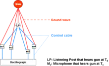 In the "Sound Ranging" graphic, the manned Listening (or Advanced) Post, is sited a few 'sound seconds (or about 2000 yards) forward of the line of the unattended microphones, it sends an electrical signal to the recording station to switch on the recording apparatus. The positions of the microphones are precisely known. The differences in sound time of arrival, taken from the recordings, were then used to plot the source of the sound by one of several techniques. See http://nigelef.tripod.com/p_artyint-cb.htm#SoundRanging