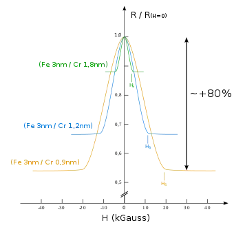 In Fe/Cr multilayers with 3-nm-thick iron layers, increasing the thickness of the non-magnetic Cr layers from 0.9 to 3 nm weakened the antiferromagnetic coupling between the Fe layers and reduced the demagnetization field, which also decreased when the sample was heated from 4.2 K to room temperature. Changing the thickness of the non-magnetic layers led to a significant reduction of the residual magnetization in the hysteresis loop. Electrical resistance changed by up to 50% with the external magnetic field at 4.2 K. Fert named the new effect giant magnetoresistance, to highlight its difference with the anisotropic magnetoresistance.[10][15] The Grünberg experiment[9] made the same discovery but the effect was less pronounced (3% compared to 50%) due to the samples being at room temperature rather than low temperature.