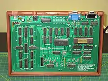 The CPU is implemented through a small set of TTL 7400 series chips, running at 6.25 MHz base clock rate, that can be overclocked by providing better chips.[3] RAM can also be increased in the same way.