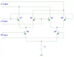 In electronics, the Gilbert cell is a type of frequency mixer. It produces output signals proportional to the product of two input signals. Such circuits are widely used for frequency conversion in radio systems.[1] The advantage of this circuit is the output current is an accurate multiplication of the (differential) base currents of both inputs. As a mixer, its balanced operation cancels out many unwanted mixing products, resulting in a "cleaner" output.