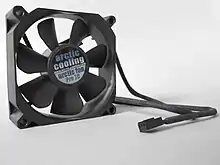 - An active cooling system forcing airflow inside or around a computer case using a fan to cause air cooling.