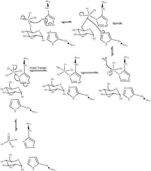 The hydrolysis of glucose 6-phosphate begins with a nucleophilic attack on the sugar-bound phosphate by His176 resulting in the formation of a phosphohistidine bond and the degradation of a carbonyl. A Negatively charged oxygen then transfers its electrons reforming a carbonyl and breaking its bond with glucose. The negatively charged glucose-bound oxygen is then protonated by His119 forming a free glucose. The phospho-intermediate produced by the reaction between His176 and the phosphate group is then broken by a hydrophilic attack; after the addition of another hydroxide and the decomposition of a carbonyl, the carbonyl is reformed kicking off the electrons originally donated by the His176 residue thereby creating a free phosphate group and completing the hydrolysis.[1]