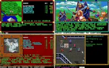 ![]() Clockwise from upper left: overland map exploration; plot cut scene; overall combat interface; dungeon exploration view/battle encounter approach | |