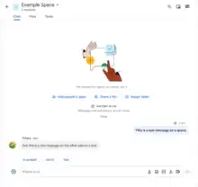Spaces, originally called Rooms, is a chat room feature built within Google Chat for topic-based collaboration, with shared files, tasks and conversations.[20][21] It functions alongside Google Chat and Google Meet to integrate group productivity features like message threading and real-time collaboration to organize topic-based conversations without exiting Gmail.[22] The feature revives the brand name previously used in a similar standalone service of the same name from 2016 to 2017, with the rebranding occurring as part of the expansion of Google Workspace to all users in 2021.[23][24] Spaces are designed for collaboration on long-term projects. In contrast to spaces, group conversations only support chatting and do not have any task functionality or a separate files tab to view a list of shared files.[25] Spaces also allow users to change the name of the chat, which is not possible with group conversations, and they allow users to only be notified when they are mentioned.[26] Each space has three tabs, a chat tab for chatting, a files tab for sharing files, and a tasks tab for creating and assigning tasks.[26]