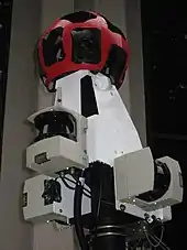 In 2017, Google used eight 20-megapixel cameras. Two cameras were facing left and right to read street signs and business names.[45] Laser range scanners from Sick AG for measuring up to 50 meters at 180° in the front of the vehicle[46] are used for recording the actual dimensions of the space being photographed. LIDAR scanners from Velodyne were added in the 2017 update. It is mounted at 45° to capture three-dimensional depth information and positional information.[45] Accurate positioning was done via a Global Positioning System, a wheel speed sensor, and inertial navigation sensor data.[39]