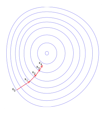 This process is illustrated in the adjacent picture. Here, is assumed to be defined on the plane, and that its graph has a bowl shape. The blue curves are the contour lines, that is, the regions on which the value of is constant. A red arrow originating at a point shows the direction of the negative gradient at that point. Note that the (negative) gradient at a point is orthogonal to the contour line going through that point. We see that gradient descent leads us to the bottom of the bowl, that is, to the point where the value of the function is minimal.
