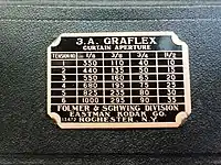 William F. Folmer, an inventor, co-owned the Folmer and Schwing Manufacturing Company, founded in New York City as a gas lamp company. As the gas lamp market declined, the company expanded into other areas including bicycles and photographic equipment, leading to the release of the first Graflex camera in 1899.[2] As the company's success grew, it chose to focus on photography and dropped its other manufacturing lines, and in 1905 was acquired by George Eastman, in 1907 becoming the Folmer Graflex Division of Eastman Kodak. After a succession of name changes, it finally became simply "Graflex, Inc." in 1945.[3] Eastman Kodak made all of the Graflex cameras in their professional equipment manufacturing plant on Clarrisa street in Rochester NY. In 1926, as a result of violations of the Sherman Anti-Trust Act (Comp. St. § 8820 et seq.) Kodak was forced to divest itself of its professional equipment division, which became Graflex Inc. This company existed under independent ownership until 1958, when the company was bought by the General Precision Equipment, which operated it as an independent division until 1968, when it was sold to the Singer Corporation, who also operated it as a division until 1973, when it was finally wrapped up and its tooling sold to the Toyo Corporation.[2][4]