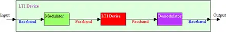 The simplest use case for group delay is illustrated in Figure 1 which shows a conceptual modulation system, which is itself an LTI system with a baseband output that is ideally an accurate copy of the baseband signal input. This system as a whole is referred to here as the outer LTI system/device, which contains an inner (red block) LTI system/device. As is often the case for a radio system, the inner red LTI system in Fig 1 can represent two LTI systems in cascade, for example an amplifier driving a transmitting antenna at the sending end and the other an antenna and amplifier at the receiving end.