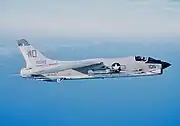 As the torpedo boats neared, Maddox fired three warning shots.[7] The North Vietnamese boats then attacked,[7] and Maddox radioed she was under attack from the three boats, closing to within 10 nautical miles (19 km; 12 mi), while located 28 nautical miles (52 km; 32 mi) away from the North Vietnamese coast in international waters.[30] Maddox stated she had evaded a torpedo attack and opened fire with its five-inch (127 mm) guns, forcing the torpedo boats away. Two of the torpedo boats had come as close as 5 nautical miles (9.3 km; 5.8 mi) and released one torpedo each, but neither one was effective, coming no closer than about 100 yards (91 m) after Maddox evaded them.[30] Another P-4 received a direct hit from a five-inch shell from Maddox; its torpedo malfunctioned at launch.[30] Four USN F-8 Crusader jets launched from Ticonderoga and 15 minutes after Maddox had fired her initial warning shots, attacked the retiring P-4s,[7] claiming one was sunk and one heavily damaged. Maddox suffered only minor damage from a single 14.5 mm bullet from a P-4's KPV heavy machine gun into her superstructure. Retiring to South Vietnamese waters, Maddox was joined by the destroyer USS Turner Joy.