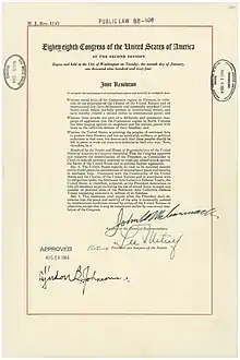 - ↑ "United States Congress resolution, Pub.L. 88–408, 78 Stat. 384" (PDF). Archived from the original (PDF) on March 6, 2016. Retrieved November 3, 2016.