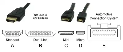 There are five HDMI connector types. Type A/B are defined in the HDMI 1.0 specification, type C is defined in the HDMI 1.3 specification, and type D/E are defined in the HDMI 1.4 specification.