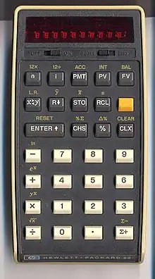 The HP-22 was a finance-oriented pocket calculator produced by Hewlett-Packard between 1975 and 1978.[1] It was designed as a replacement for the short-lived HP-70, and was one of a set of three calculators, the others being the HP-21 and HP-25, which were similarly built but aimed at different markets.[2]