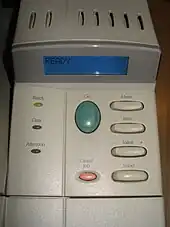 With the advent of the HP LaserJet 4000 in 1997, the control panel was completely redesigned. The Shift button, which might have been confusing, was gone. There was a Menu, an Item and a Value button. Each of these might be clicked left or right. There was a Select button, a large green Go button, and a small orange Cancel Job button. Configuration through the control panel was easier and more intuitive: menus could be navigated with the Menu button. Then, items within the menu selected with the Item button. The Value button – which had - (decrease) and + (increase) indications – could be used to select a specific setting or value. The Select button was used to select or confirm a particular choice. The display was adapted to a blue-backlit two-line LCD display.