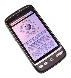 The HTC Desire (codenamed Bravo)[4] is the first smartphone of the Desire series developed by HTC. It was announced on 16 February 2010 and released in Europe and Australia in the second quarter of the same year. The HTC Desire was HTC's third flagship phone running Android 2.1 Eclair[5] which can be upgraded to 2.2 Froyo or 2.3 Gingerbread.[6] Internally it bears a strong resemblance to the Nexus One, but differs in some features.