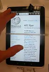 The HTC Flyer (also known as the HTC EVO View 4G) is a tablet computer by HTC Corporation. It was announced at the Mobile World Congress (MWC) 2011 and released in May 2011.[3] Unlike other tablets announced at MWC, the Flyer has a single-core 1.5 GHz CPU[4] and ran 2.3.3 (Gingerbread).[2][5] In February 2011 it was reported that HTC had claimed via Facebook that "Flyer will be getting a Honeycomb upgrade in Q2", however an HTC representative subsequently stated "I can confirm that we are working to bring a Honeycomb update to Flyer in short order – however, I don't have any specific information on what the timing may be."[6] The version running Android 3.2 Honeycomb was released later in 2011. The HTC Flyer can be updated up to Android 4.1.2 Jelly Bean through the use of custom ROMs.