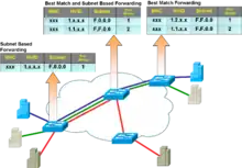 A full description of the HVLAN header can be found in [1], the most important field being the HVID. When traversing the carrier's Ethernet network, the HVLAN frames can be forwarded using HVID only, MAC address only or a combination of both. There is an explicit bit in an HVLAN frame that prevents the carrier's core switches from learning the HVLAN frames' MAC address when unnecessary. To understand HVLAN operation, consider a scenario (see diagram) which illustrates the provision of 3 point-to-point services (blue, green, and red) over an HVLAN network. The diagram shows all forwarding table entries needed to transport the 3 services. Only forwarding entries for one direction (left-to-right) are displayed, similar entries implement the other direction.