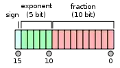 The minimum strictly positive (subnormal) value is 2−24 ≈ 5.96 × 10−8. The minimum positive normal value is 2−14 ≈ 6.10 × 10−5. The maximum representable value is (2−2−10) × 215 = 65504.