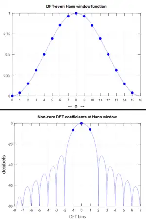 An N-length DFT of the window function samples the DTFT at frequencies for integer values of From the expression immediately above, it is easy to see that only 3 of the N DFT coefficients are non-zero. And from the other expression, it is apparent that all are real-valued. These properties are appealing for real-time applications that require both windowed and non-windowed (rectangularly windowed) transforms, because the windowed transforms can be efficiently derived from the non-windowed transforms by convolution.[4][lower-alpha 3][lower-alpha 4]