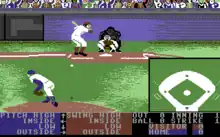 Play is controlled with a joystick or arrow keys and an action button. One of the four cardinal directions is used to choose the pitch, and again to aim it towards low, high, inside (towards batter), or outside (away from batter). The same directions are used to aim the swing when batting. When fielding after a hit, the defensive player closest to the ball will flash to show it is the one currently under control. The four directions are then used to throw to one of the four bases.