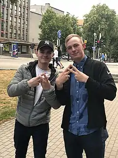 Verbal use of the word hashtag is sometimes used in informal conversations.[43] Use may be humorous, such as "I'm hashtag confused!"[42] By August 2012, use of a hand gesture, sometimes called the "finger hashtag", in which the index and middle finger both hands are extended and arranged perpendicularly to form the hash, was documented.[44][45]