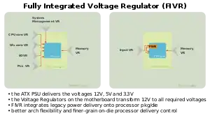 - Fully integrated voltage regulator (FIVR), thereby moving some of the components from motherboard onto the CPU.[37][38][39]