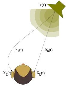 Humans estimate the location of a source by taking cues derived from one ear (monaural cues), and by comparing cues received at both ears (difference cues or binaural cues). Among the difference cues are time differences of arrival and intensity differences. The monaural cues come from the interaction between the sound source and the human anatomy, in which the original source sound is modified before it enters the ear canal for processing by the auditory system. These modifications encode the source location and may be captured via an impulse response which relates the source location and the ear location. This impulse response is termed the head-related impulse response (HRIR). Convolution of an arbitrary source sound with the HRIR converts the sound to that which would have been heard by the listener if it had been played at the source location, with the listener's ear at the receiver location. HRIRs have been used to produce virtual surround sound.[2][3]