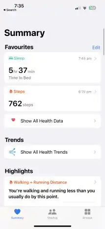 The Health app tracks and stores various health data and metrics, as well as clinical medical records for users with supported health insurers or hospitals signed up to the "Apple Health Records" program.[1] Data is divided into several categories: activity, body measurements, cycle tracking, hearing, heart, medications, mental wellbeing, mobility, nutrition, respiratory, sleep, symptoms, vitals, and other data.