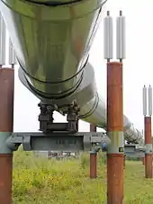 Building on permafrost is difficult because heat from the structure can thaw the permafrost. Heat pipes are used in some cases to avoid the risk of destabilization. For example, in the Trans-Alaska Pipeline System residual ground heat remaining in the oil as well as heat produced by friction and turbulence in the moving oil could conduct down the pipe's support legs and melt the permafrost on which the supports are anchored. This would cause the pipeline to sink and possibly be damaged. To prevent this, each vertical support member has been mounted with four vertical heat pipe thermosyphons.[42]