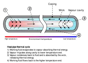 At the hot interface of a heat pipe, a volatile liquid in contact with a thermally conductive solid surface turns into a vapor by absorbing heat from that surface. The vapor then travels along the heat pipe to the cold interface and condenses back into a liquid, releasing the latent heat. The liquid then returns to the hot interface through capillary action, centrifugal force, or gravity and the cycle repeats.