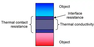 - For each interface between two objects in contact with each other, there will be a temperature drop across the interface. For such composite systems, the temperature drop across the interface may be appreciable.[11] This temperature change may be attributed to what is known as the thermal contact resistance.[11] Thermal interface materials (TIM) decrease the thermal contact resistance.