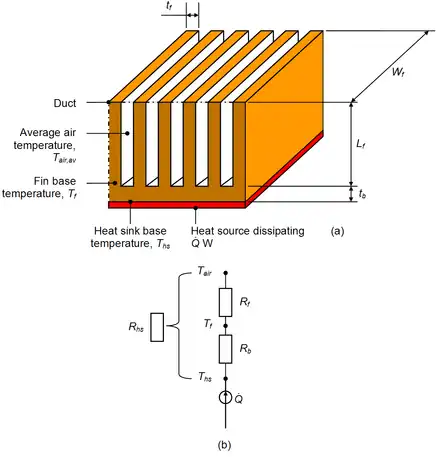The heat sink thermal resistance model consists of two resistances, namely the resistance in the heat sink base, , and the resistance in the fins, . The heat sink base thermal resistance, , can be written as follows if the source is a uniformly applied the heat sink base. If it is not, then the base resistance is primarily spreading resistance: