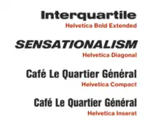Designed by Matthew Carter and Hans-Jürg Hunziker for cold type.[62] It shares some design elements with Helvetica Inserat, but uses a curved tail in Q, downward pointing branch in r, and tilde bottom £. Carter has said that in practice it was designed to be similar to Schmalfette Grotesk and to compete in this role with British designs Impact and Compacta, as this style was popular at the time.[63] Carter, who also later designed Helvetica Greek, had designed a modernised version of Akzidenz-Grotesk for signage at Heathrow in 1961, and commented later "if we'd known about [Helvetica] I'm sure we would have used it, since it's a much better typeface than the one I drew. But the typesetting trade was very conservative then, and new type designs traveled slowly."[32][64] The family consists of Helvetica Compressed, Helvetica Extra Compressed and Helvetica Ultra Compressed fonts. It has been digitised, for instance in the Adobe Helvetica release.