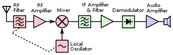 An important and widely used application of the heterodyne technique is in the superheterodyne receiver (superhet). In the typical superhet, the incoming radio frequency signal from the antenna is mixed (heterodyned) with a signal from a local oscillator (LO) to produce a lower fixed frequency signal called the intermediate frequency (IF) signal. The IF signal is amplified and filtered and then applied to a detector that extracts the audio signal; the audio is ultimately sent to the receiver's loudspeaker.