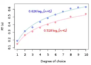 Hick's law, or the Hick–Hyman law, named after British and American psychologists William Edmund Hick and Ray Hyman, describes the time it takes for a person to make a decision as a result of the possible choices: increasing the number of choices will increase the decision time logarithmically. The Hick–Hyman law assesses cognitive information capacity in choice reaction experiments. The amount of time taken to process a certain amount of bits in the Hick–Hyman law is known as the "rate of gain of information". The plain language implication of the finding is that increasing the number of choices does not directly increase the time to choose. In other words, twice as many choices does not result in twice as long to choose. Also, because the relationship is logarithmic, the increase in time it takes to choose becomes less and less as the number of choices increases.