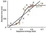 The generalization of Hick's law was also tested in studies on the predictability of transitions associated with the reaction time of elements that appeared in a structured sequence.[8][9] This process was first described as being in accordance to Hick's law,[10] but more recently it was shown that the relationship between predictability and reaction time is sigmoid, not linear associated with different modes of action.[11]