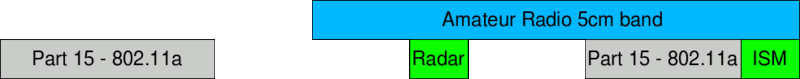 The following is a list of the 802.11 channels that overlap into an amateur radio band under the FCC in the United States. Note that the 5 cm amateur band extends from 5.65 to 5.925 GHz, so that there are many frequencies outside the Part 15 ISM/UNII block used for 802.11a. Many commercial grade 802.11a access points can also operate in between the normal channels by using 5 MHz channel spacing instead of the standard 20 MHz channel spacing. 802.11a channels 132, 136 and 140 are only available for unlicensed use in ETSI regions. Channels and frequencies marked in red should not be used.