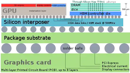 The larger number of connections to the memory, relative to DDR4 or GDDR5, required a new method of connecting the HBM memory to the GPU (or other processor).[14] AMD and Nvidia have both used purpose-built silicon chips, called interposers, to connect the memory and GPU. This interposer has the added advantage of requiring the memory and processor to be physically close, decreasing memory paths. However, as semiconductor device fabrication is significantly more expensive than printed circuit board manufacture, this adds cost to the final product.