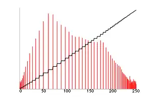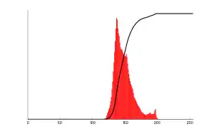 ![]() Corresponding histogram (red) and cumulative histogram (black) |